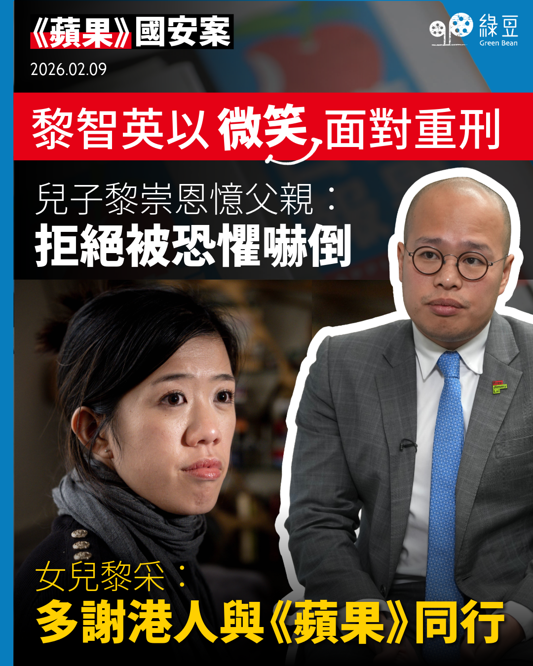 黎智英今日在庭上以微笑面對重刑,令身在海外的兒子非常感動,令他回想起父親撰寫的《蘋果日報》創刊社論中的一句:「我們害怕 1997 年的回歸嗎?當然害怕,但我們拒絕被恐懼嚇倒。」雖然從未親身跟父親討論判刑,但他堅信父親仍拒絕被恐懼嚇倒。