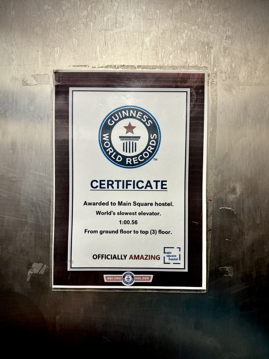 照片:在首都薩格勒布的一間旅館,電梯中的告示。坐這架電梯時,最初只覺較正常慢,看到海報後覺幽默。後來知道 fjaka,覺得坐𨋢也能悟出大道理。